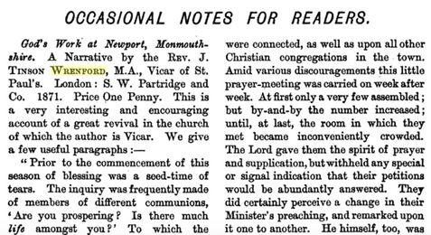 The Christian Miscellany, and Family Visiter, (London: Wesleyan Conference Office, 1872), p. 93. These excerpts comes from God's Work at Newport, Monmouthshire. A Narrative by the Rev. J. Tinson Wrenford, M.A., Vicar of St. Paul's. London: S. W. Partridge and Co. 1871.