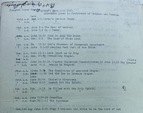 He was convicted to learn about, and seek, revival as the result of reading about the Welsh revival and coming to believe that God could bring about the same results in China. He accordingly carefully read and studied four books over the course of a year: A. J. Gordon's Ministry of the Spirit, S. D. Gordon's Quiet Talks on Power, Charles Finney's two books, Lectures on Revival and Memoirs, and then proceeded to hold revival meetings.